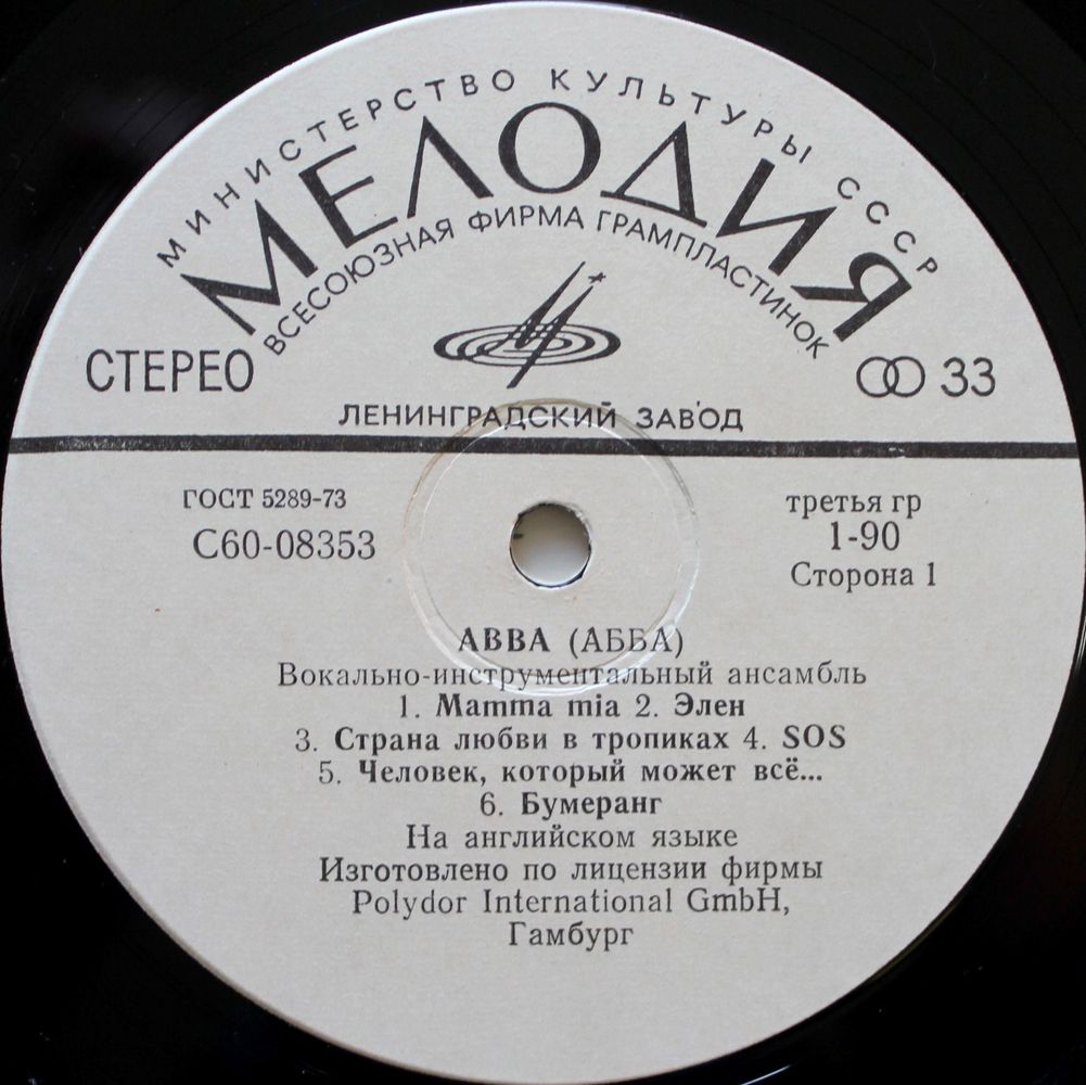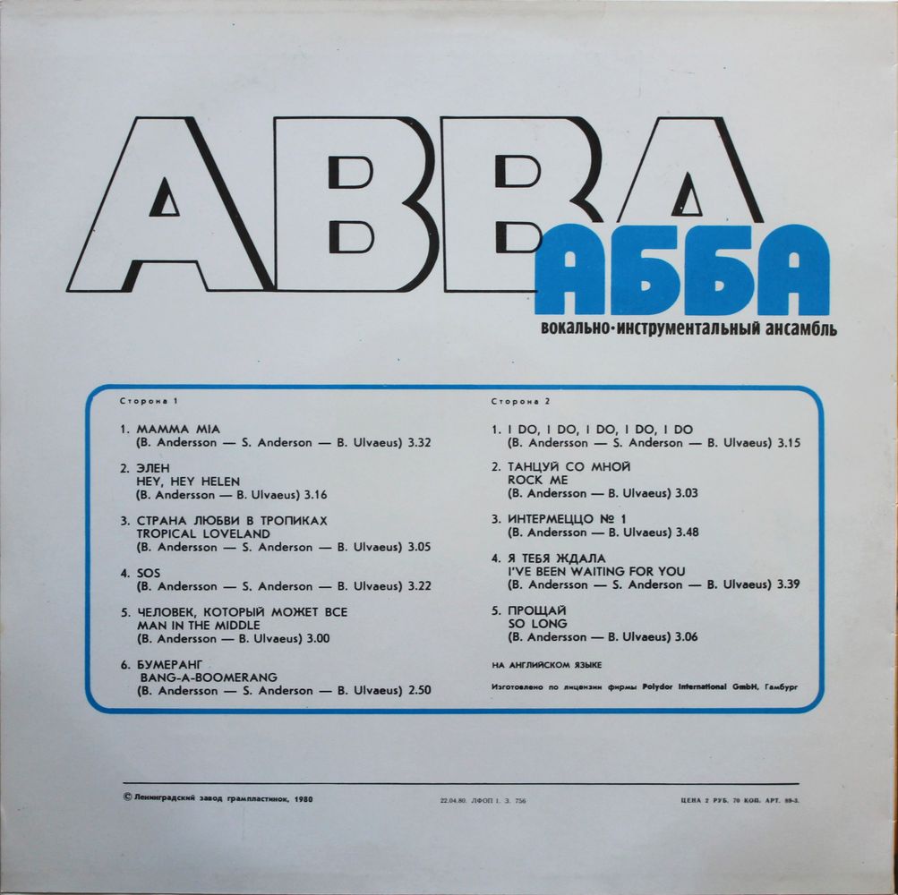 A1 Mamma Mia A2 Hey, Hey Helen (Элен) A3 Tropical Loveland (Страна любви в тропиках) A4 SOS A5 Man In The Middle (Человек, который может все) A6 Bang-a-Boomerang (Бумеранг) B1 I Do, I Do, I Do, I Do, I Do B2 Rock Me (Танцуй со мной) B3 Intermezzo №1 (Интермеццо №1) B4 I've Been Waiting For You (Я тебя ждала) B5 So Long (Прощай)