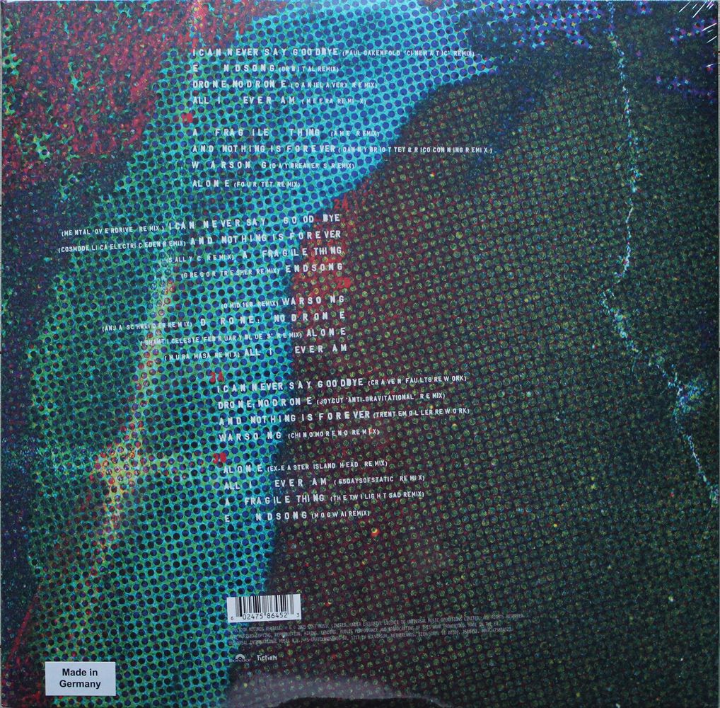 A1 I Can Never Say Goodbye (Paul Oakenfold 'Cinematic' Remix) A2 Endsong (Orbital Remix) A3 Drone:Nodrone (Daniel Avery Remix) A4 All I Ever Am (Meera Remix) B1 A Fragile Thing (Âme Remix) B2 And Nothing Is Forever (Danny Briottet & Rico Conning Remix) B3 Warsong (Daybreakers Remix) B4 Alone (Four Tet Remix) C1 I Can Never Say Goodbye (Mental Overdrive Remix) C2 And Nothing is Forever (Cosmodelica Electric Eden Remix) C3 A Fragile Thing (Sally C Remix) C4 Endsong (Gregor Tresher Remix) D1 Warsong (Omid 16B Remix) D2 Drone:Nodrone (Anja Schneider Remix) D3 Alone (Shanti Celeste 'February Blues' Remix) D4 All I Ever Am (Mura Masa Remix) E1 I Can Never Say Goodbye (Craven Faults Rework) E2 Drone:Nodrone (JoyCut 'Anti-Gravitational' Remix) E3 And Nothing Is Forever (Trentemøller Rework) E4 Warsong (Chino Moreno Remix) F1 Alone (Ex-Easter Island Head Remix) F2 All I Ever Am (65daysofstatic Remix) F3 A Fragile Thing (The Twilight Sad Remix) F4 Endsong (Mogwai Remix)