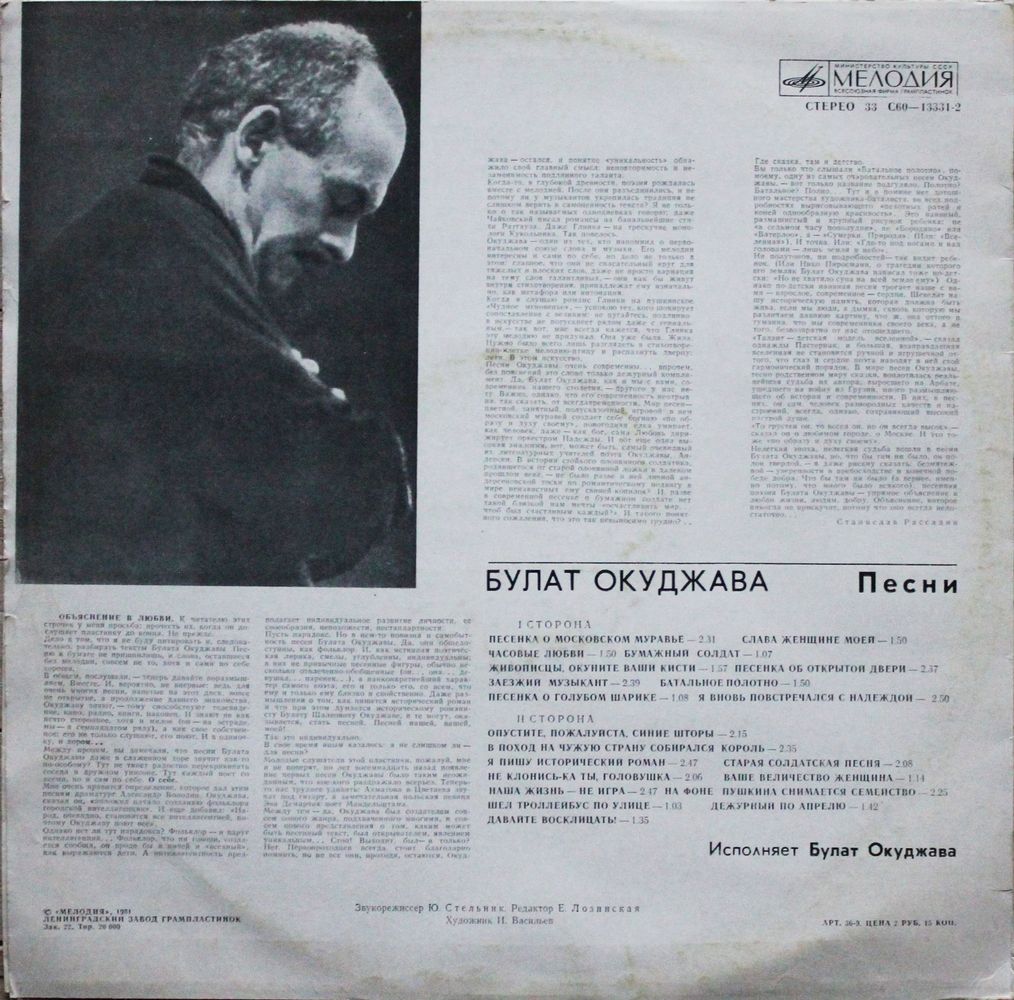 A01 Песенка о московском муравье A02 Слава Женщине Моей A03 Часовые Любви A04 Бумажный Солдат A05 Живописцы, Окуните Ваши Кисти A06 Песенка Об Открытой Двери A07 Заезжий Музыкант A08 Батальное Полотно A09 Песенка О Голубом Шарике A10 Я Вновь Повстречался С Надеждой B01 Опустите, Пожалуйста, Синие Шторы B02 В Поход На Чужую Страну Собирался Король B03 Я Пишу Исторический Роман B04 Старая Солдатская Песня B05 Не Клонись-ка Ты, Головушка B06 Ваше Величество Женщина B07 Наша Жизнь - Не Игра B08 На Фоне Пушкина Снимается Семейство B09 Шел Троллейбус По Улице B10 Дежурный По Апрелю B11 Давайте Восклицать!