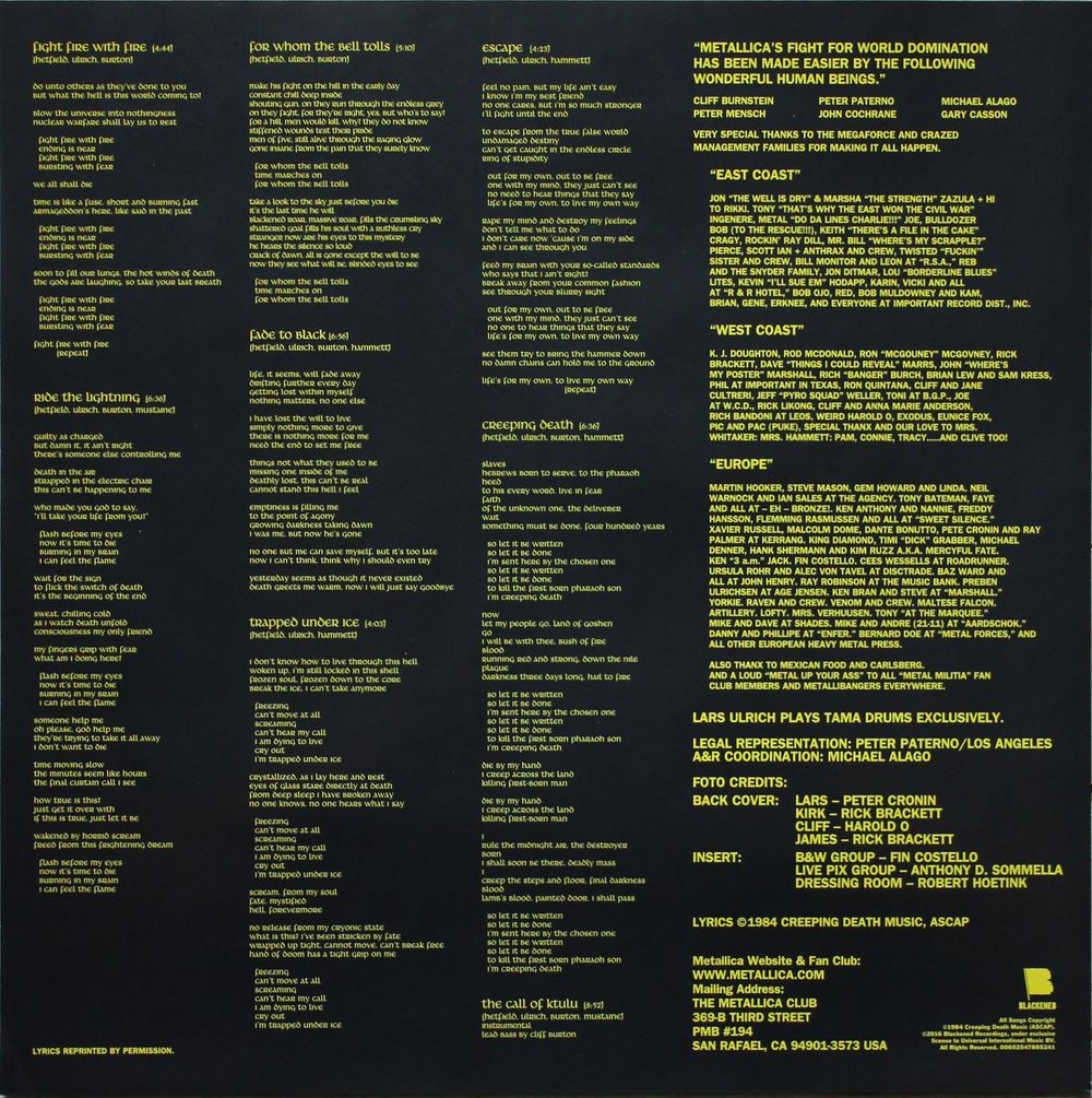 A1 Fight Fire With Fire A2 Ride The Lightning A3 For Whom The Bell Tolls A4 Fade To Black B1 Trapped Under Ice B2 Escape B3 Creeping Death B4 The Call Of Ktulu