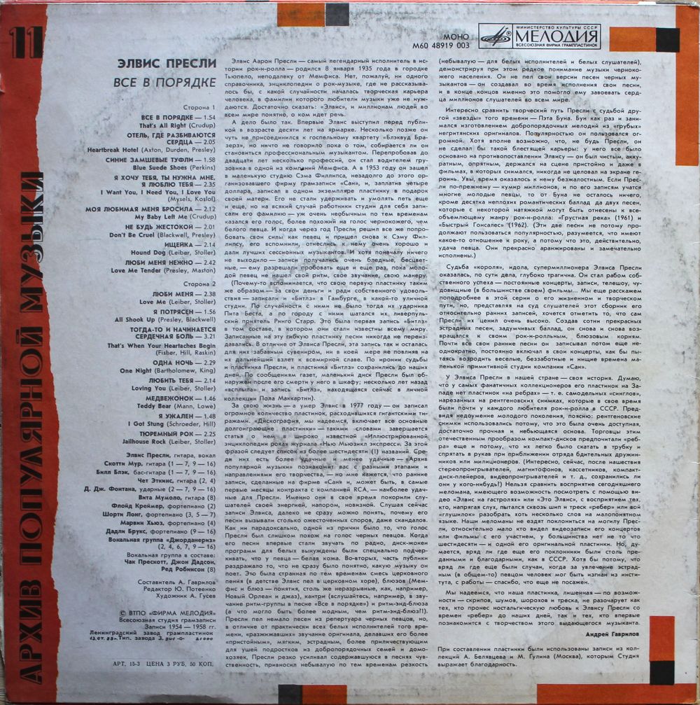 A1 Все в порядке (That's All Right) A2 Отель, где разбиваются сердца (Heartbreak Hotel) A3 Синие замшевые туфли (Blue Suede Shoes) A4 Я хочу тебя, ты нужна мне, я люблю тебя (I Want You, I Need You, I Love You) A5 Моя любимая меня бросила (My Baby Left Me) A6 Не будь жестокой (Don't Be Cruel) A7 Ищейка (Hound Dog) A8 Люби меня нежно (Love Me Tender) B1 Люби меня (Love Me) B2 Я потрясен (All Shook Up) B3 Тогда-то и начинается сердечная боль (That's When Your Heartaches Begin) B4 Одна ночь (One Night) B5 Любить тебя (Loving You) B6 Медвежонок (Teddy Bear) B7 Я ужален (I Got Stung) B8 Тюремный рок (Jailhouse Rock)