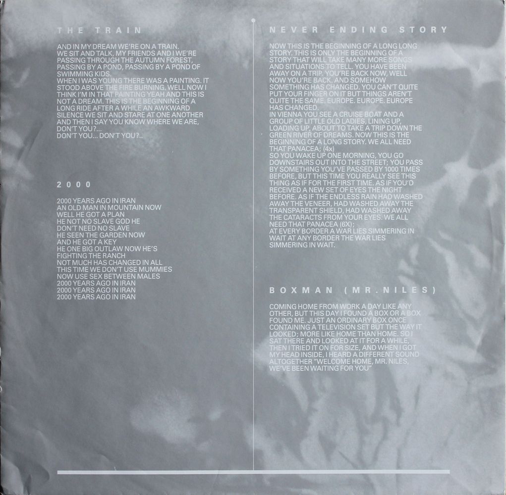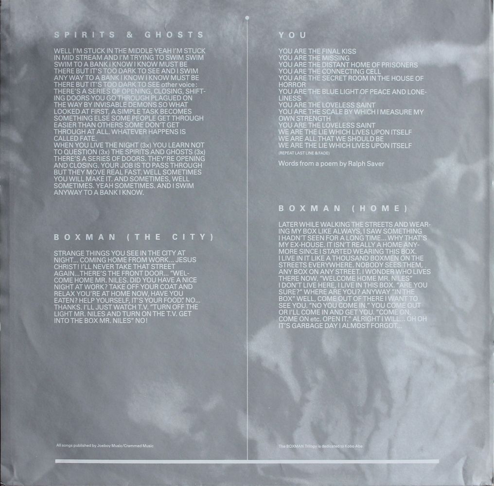 A1 Roman P. A2 The Train A3 2000 A4 Never Ending Story B1 Boxman (Mr. Niles) B2 Spirits & Ghosts (Part 1) / Spirits & Ghosts (Part 2) B3 Boxman (The City) B4 You B5 Boxman (Home)